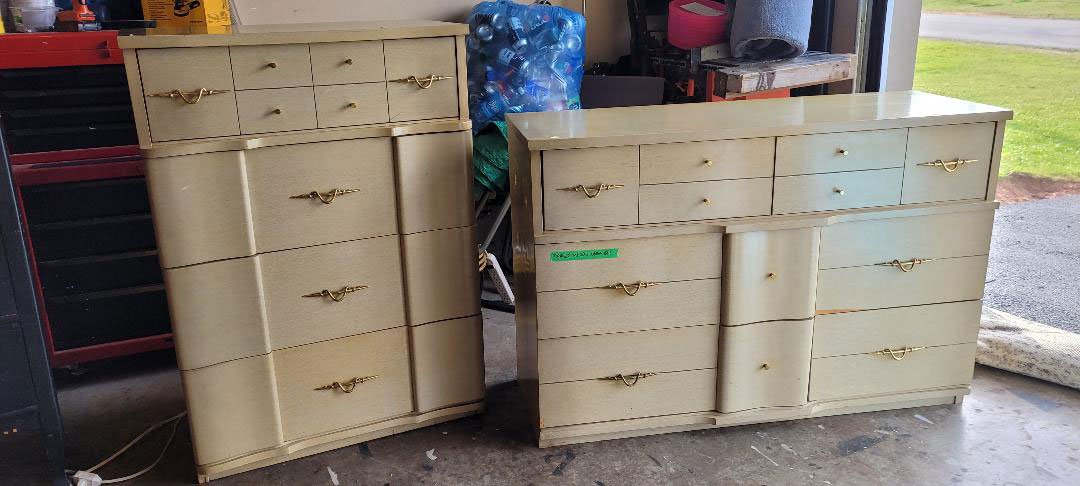 I found this set at Restore PEI, a pair of tired mid-century dressers, yellowed with age and weighed down by outdated hardware. But their bold, sculptural lines had real potential. I set out to completely reimagine them as modern statement pieces that blend vintage character with fresh elegance.