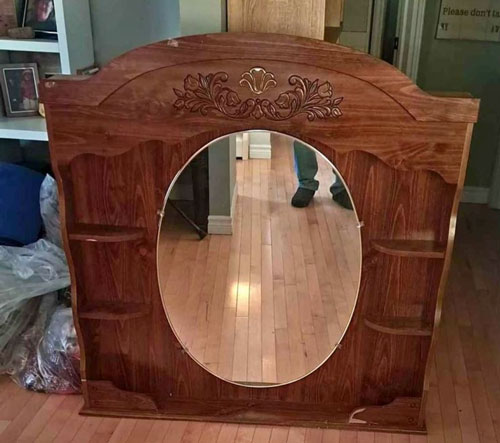 I found both pieces of furniture on Facebook marketplace for free from two different people. They were pretty beat up. I enjoy giving new life to old furniture that would typically end up in a dump. I needed a bar in my home and decided to turn these two random pieces into my bar by joining them together. The paint for the project was kicking around my house. I mixed a few colors of paint together to get the colors I wanted. The fabric for the pull out bin was left over from another project I had done in my house. I used a hot glue gun to wrap up a very sturdy cardboard box with the fabric, then added the original hardware to it from the bureau. I had a can of Rustoleum spray paint left over from another project and used it to spray paint all the original hardware which I reused. I needed two more knobs and found those kicking around my junk drawer. So this project basically was a free project and cost me my time only. Re working furniture is very relaxing and I enjoy doing it. I had to sand it all down, prime it with Behr primer. I did two coats of primer. I then painted it, two coats of paint. A few holes needed to be filled with wood filler as well. One drawer was beyond repair and that is where I added the pull out fabric covered bin. I knocked off the tiny bottom shelves on the top piece of furniture to open it up more. I really love how my project turned out.