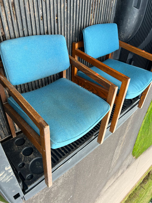 We picked up a couple of upholstered chairs from the Habitat store here on the island. We saw great potential in them. We wanted to update them with a new stain and upholstery while still honouring their original colour. We removed the seat and backing and completely re-did the cushions with new foam padding and fabric. We then stripped and sanded the wood, giving it some new life with a warm stain and a protective coating. We love the addition of these chairs in our cozy den.