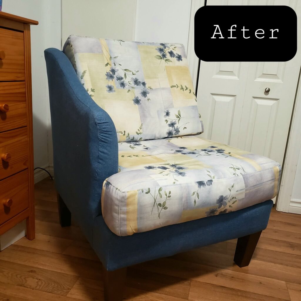 My chaise lounge was a lovely piece of furniture when I bought it almost 25 years ago. It had since turned into a tired-looking, saggy, uncomfortable pièce of furniture that was too large for my space, and too low to transfer in and out of from my wheelchair. It was quite a big project and took me a couple of months to finish, but I'm very happy with the results. I repurposed all the high-density foam and webbing from the original chaise lounge, used leftover floral print from a previous project, and a large piece of denim gifted from my Mom. The only thing I had to buy was a higher set of legs to make the chair the ideal height for wheelchair transfers. Total cost for this transformation - $46.