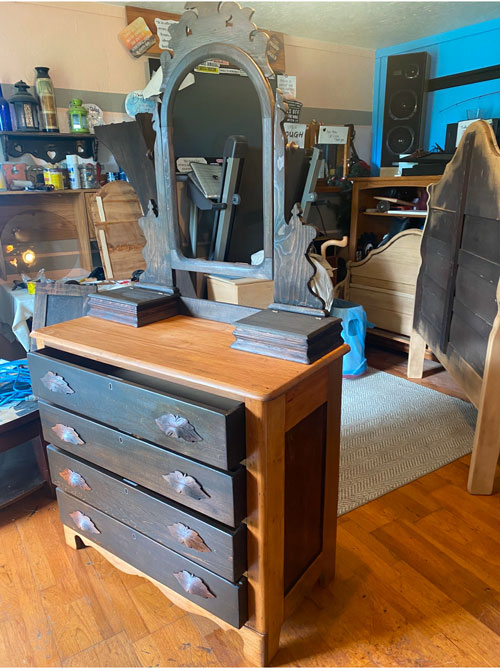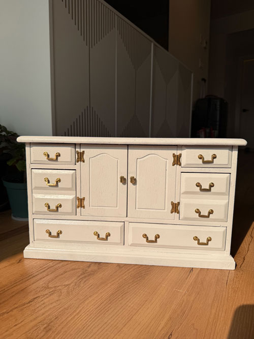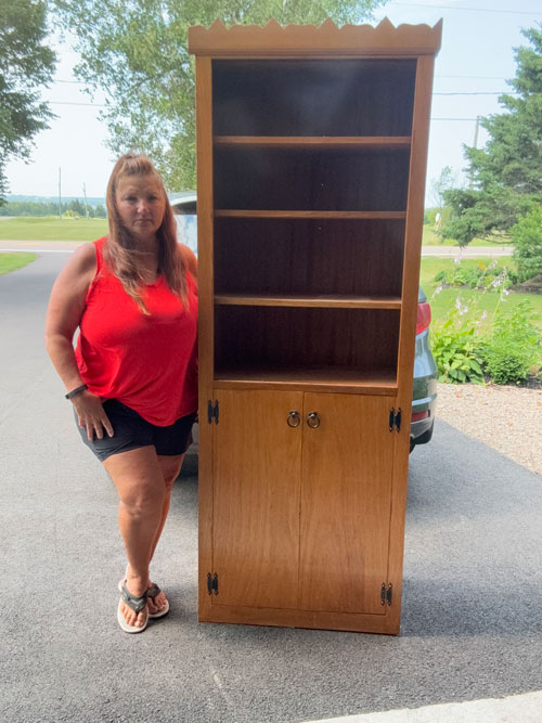 I purchased this handmade piece from Marketplace to make into a bar cabinet. I cut off 8 inches from the bottom, removed one of the shelves, added an arch detail and trim moulding to match other pieces in my home. I stripped the finish and applied a paint wash and stain to give a modern look and also added modern legs. I kept the original hardware. I hope that the original owner will be happy to see that their piece got a new life!